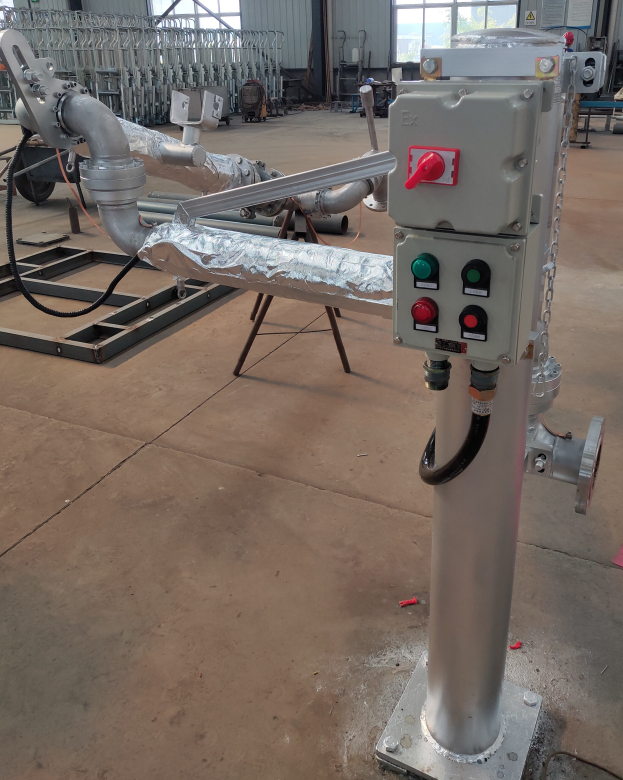 根據(jù)業(yè)主要求,乙二胺需在定溫60℃下方可進行裝卸作業(yè)。我公司電氣專業(yè)工程師成功設計出電溫控設施,可在鶴管管線加熱至60℃后經(jīng)熱傳感器信號輸出后停止加熱,在鶴管管線溫度低于60℃自動重啟加熱設備。該設備操作簡單,安全穩(wěn)定性高,一次性設定即可,能有效防范因操作不當造成裝卸不暢及設備使用壽命短的問題。