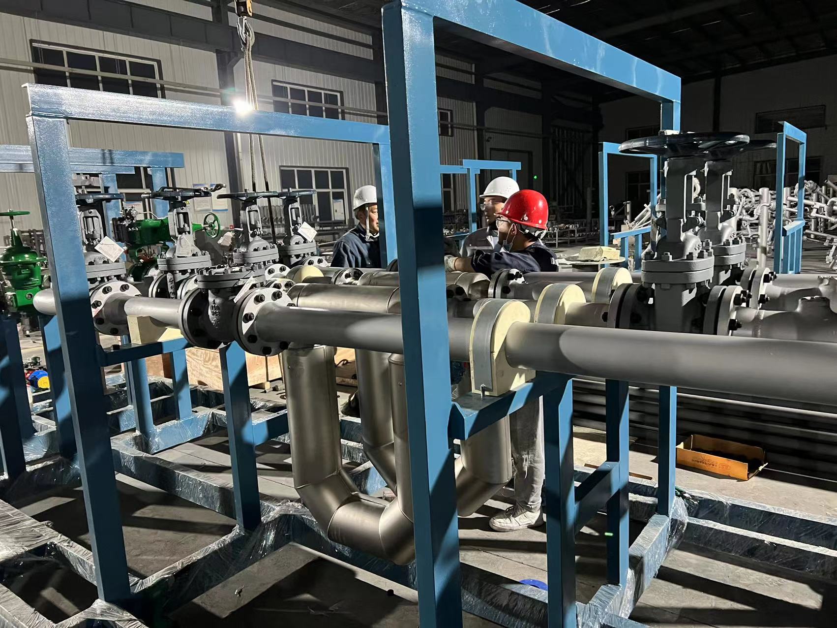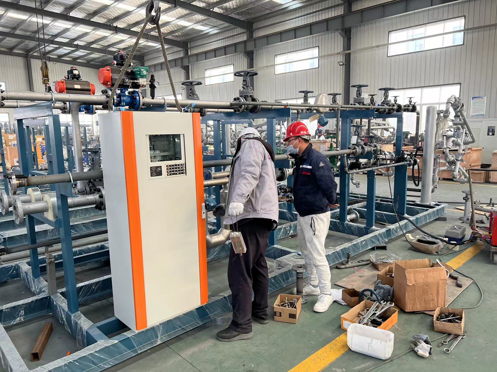 液化烴類介質(zhì)槽車裝車系統(tǒng)比油品槽車裝車系統(tǒng)復(fù)雜,現(xiàn)場組配裝車系統(tǒng),安裝和調(diào)試周期長,質(zhì)量不穩(wěn)定。為克服以上缺點(diǎn),在工廠內(nèi),將裝車系統(tǒng)的儀表和設(shè)備集成在一個(gè)橇裝架上,并完成電氣安裝、強(qiáng)度試驗(yàn)和低溫測試等,裝車橇到達(dá)用戶裝車現(xiàn)場后,接地角螺栓,連接工藝管線、通訊和供電線路就可以使用。結(jié)合液化烴類介質(zhì)裝車橇技術(shù)特點(diǎn),對(duì)液化烴裝車系統(tǒng)中的設(shè)計(jì)數(shù)據(jù)、功能要求、操作方法進(jìn)行敘述,綜合國內(nèi)裝車系統(tǒng)在使用中出現(xiàn)的問題提出了解決辦法。以下為公司近期液化烴類裝車撬的生產(chǎn)現(xiàn)場。